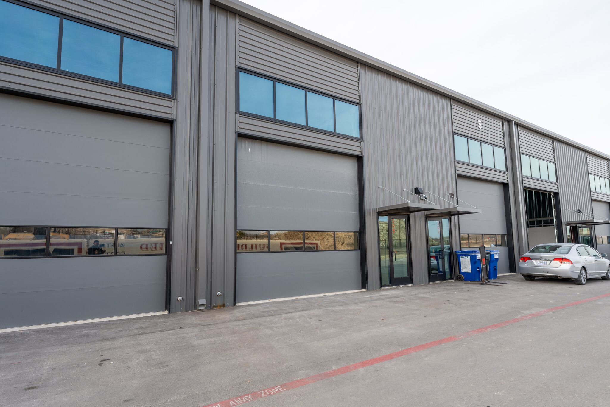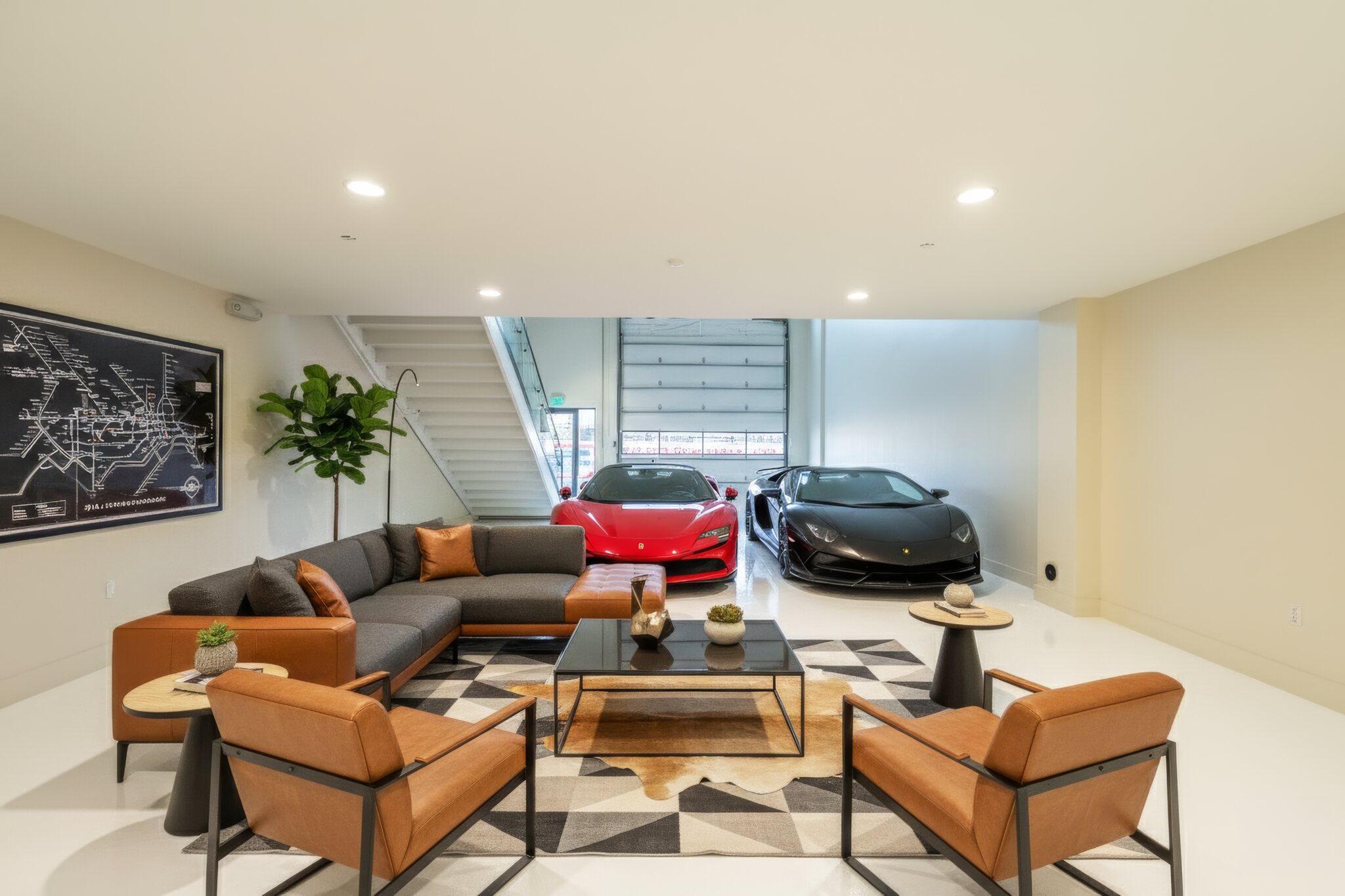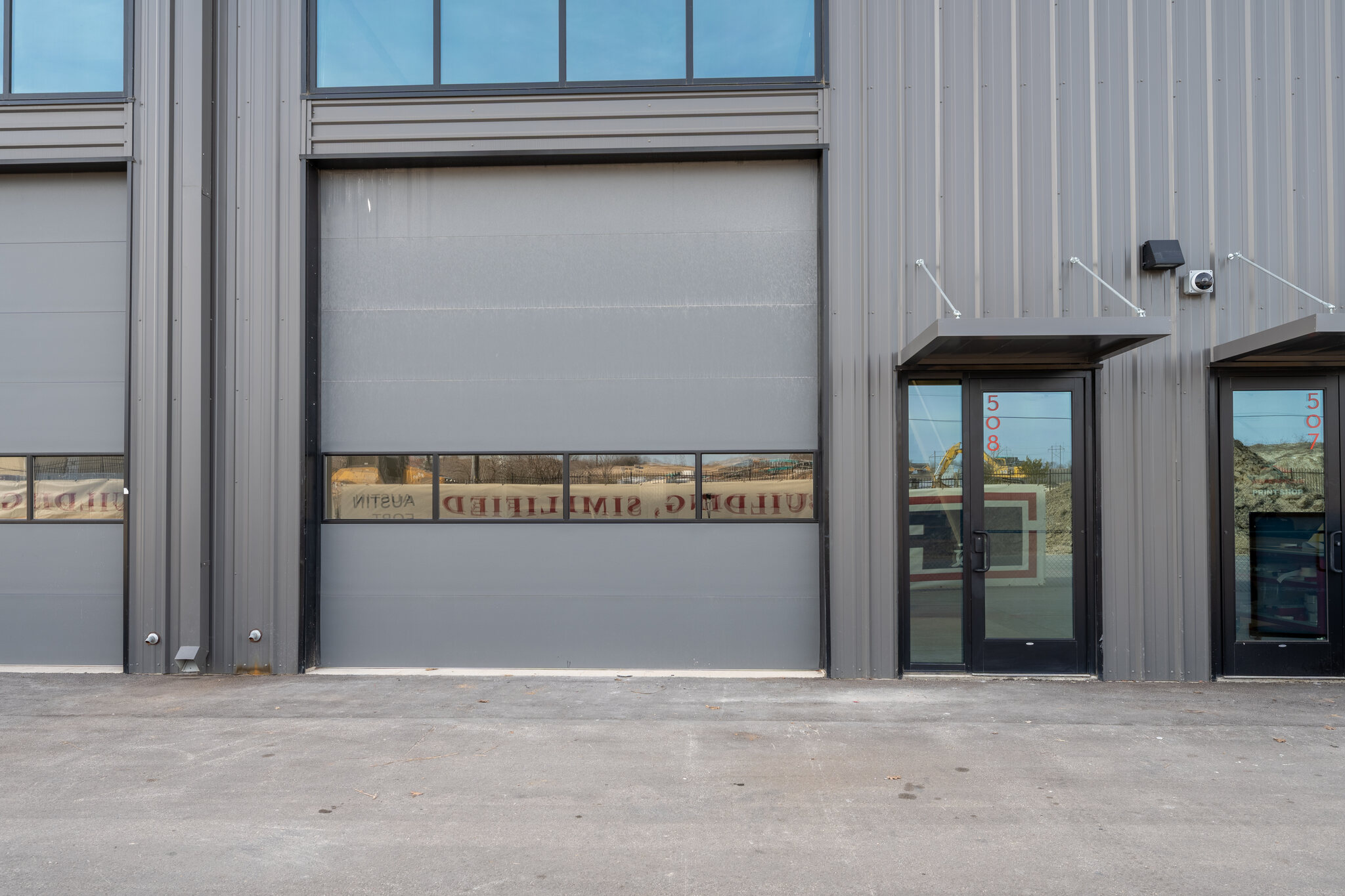 The large unit offers approximately 2,250 sq. ft. of total space, including a 1,500 sq. ft. ground-level garage with 20’+ double-height ceilings and capacity for 6-8 vehicles. The fully insulated, HVAC-equipped space features a high-load concrete slab, full utilities, and a large glass and metal roll-up door. Above, a 750 sq. ft. loft-style mezzanine provides flexible space ideal for a kitchen, bathroom, office, or lounge