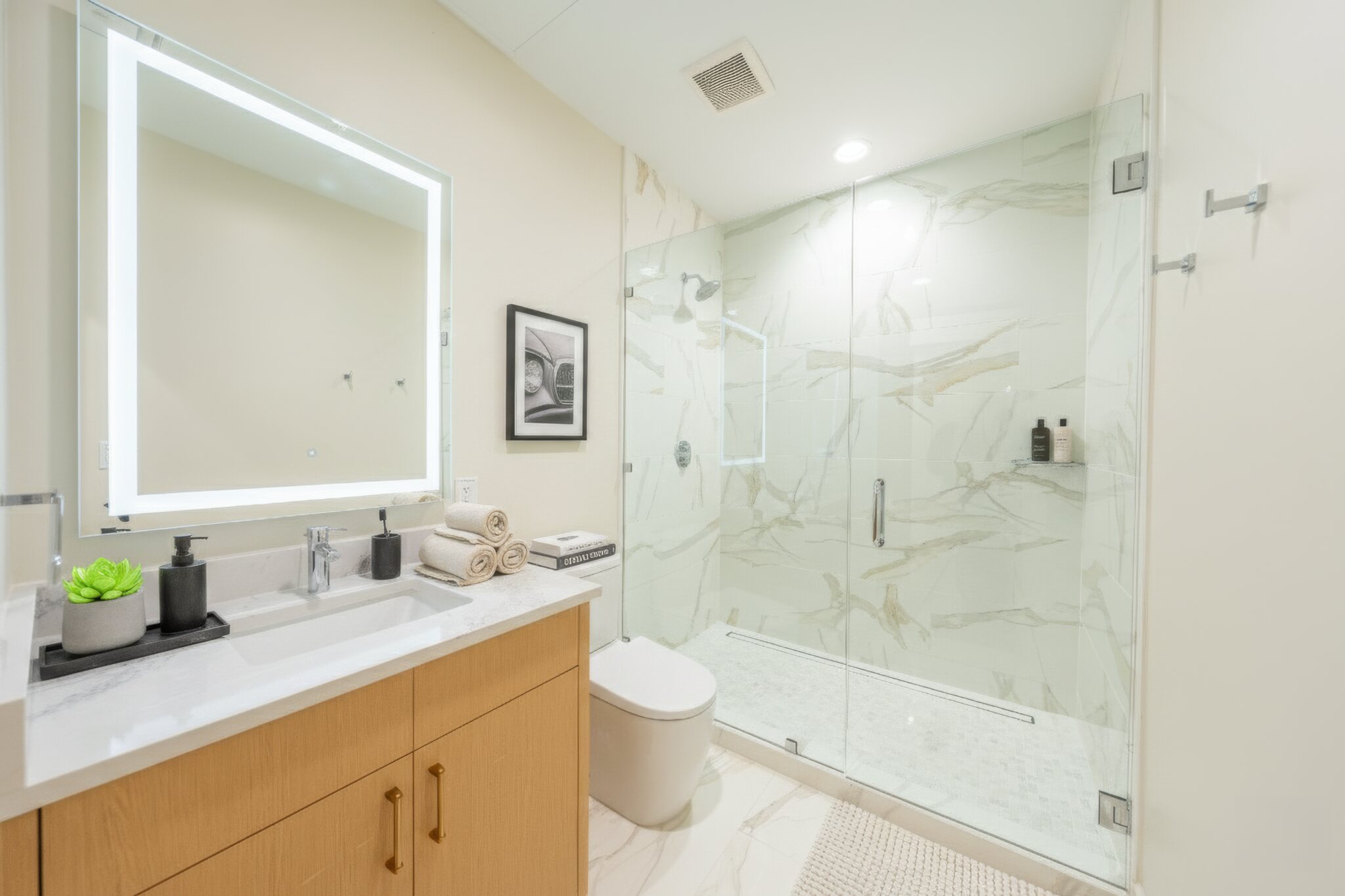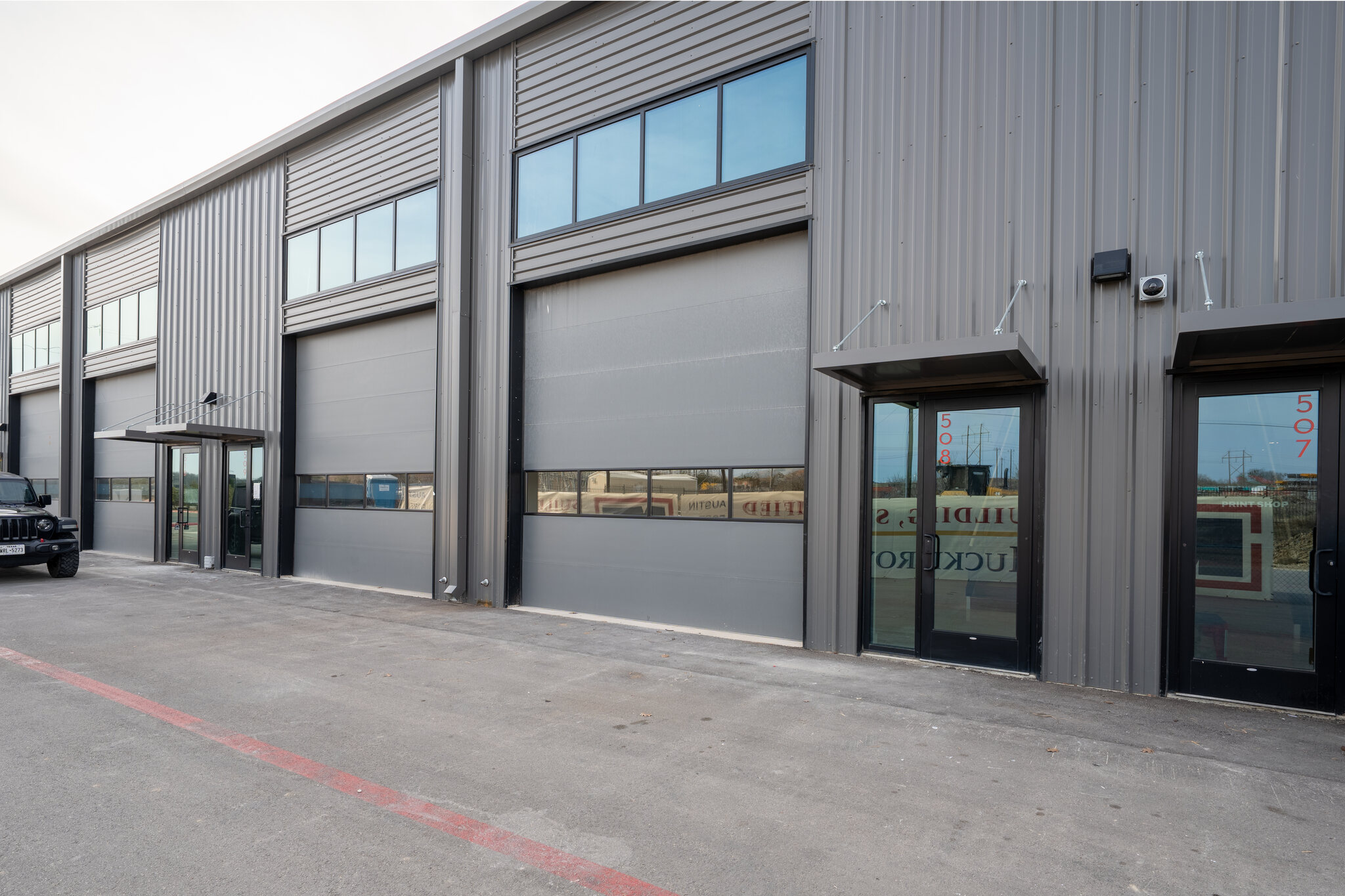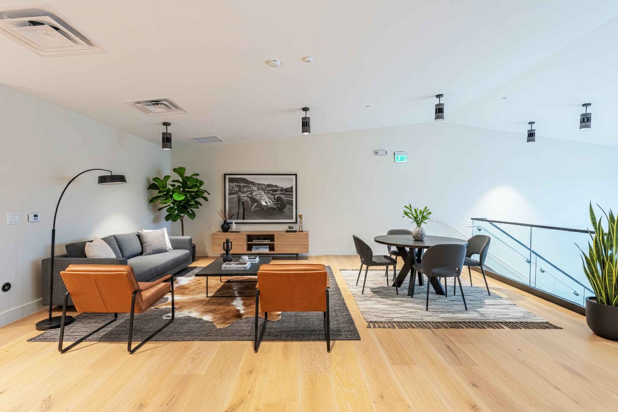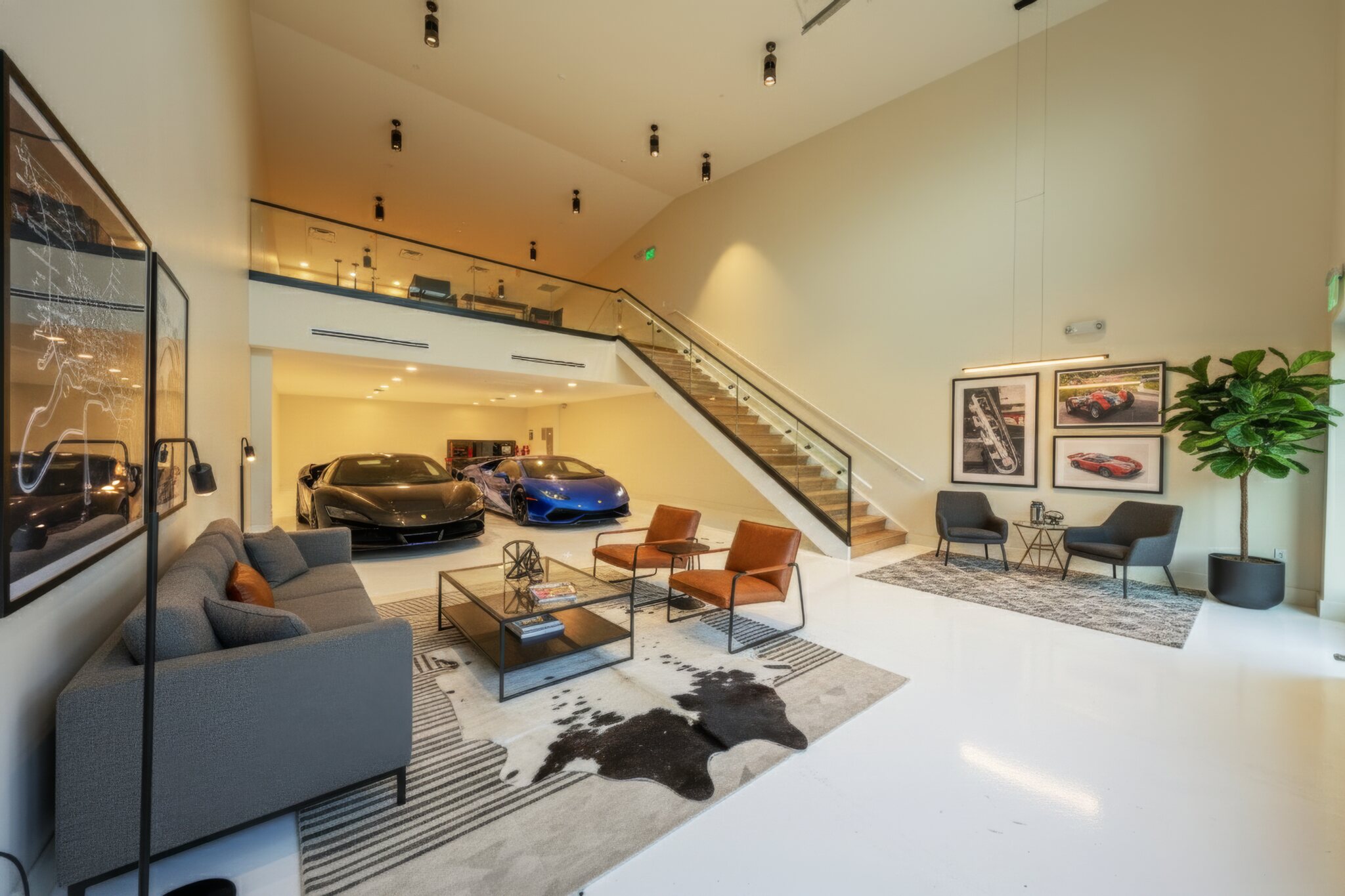 The large unit offers approximately 2,250 sq. ft. of total space, including a 1,500 sq. ft. ground-level garage with 20’+ double-height ceilings and capacity for 6-8 vehicles. The fully insulated, HVAC-equipped space features a high-load concrete slab, full utilities, and a large glass and metal roll-up door. Above, a 750 sq. ft. loft-style mezzanine provides flexible space ideal for a kitchen, bathroom, office, or lounge