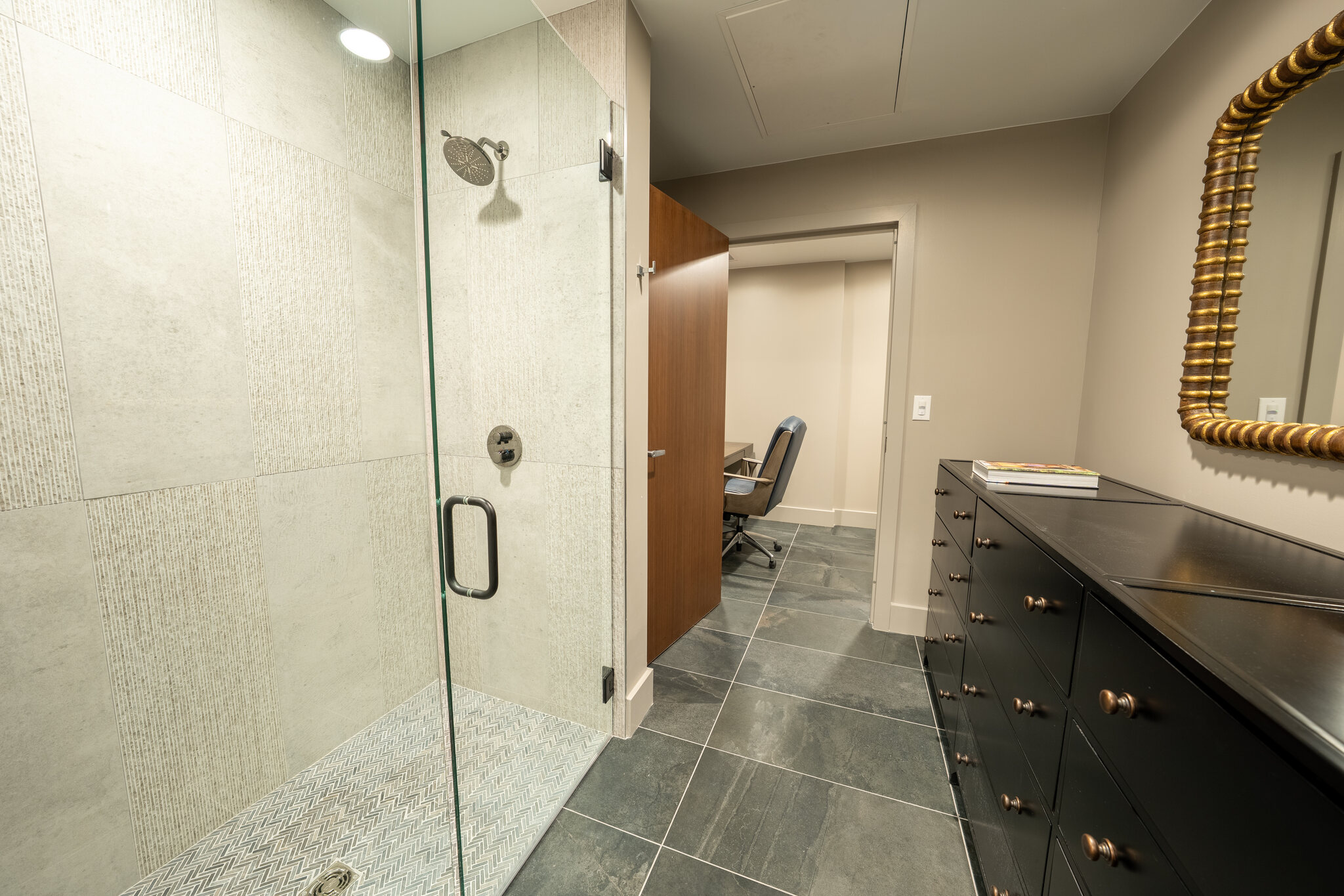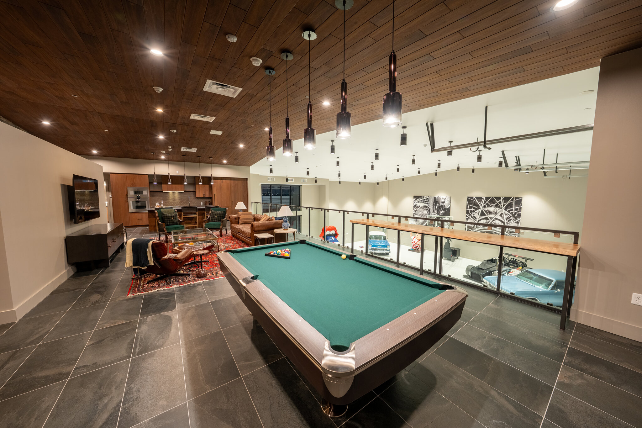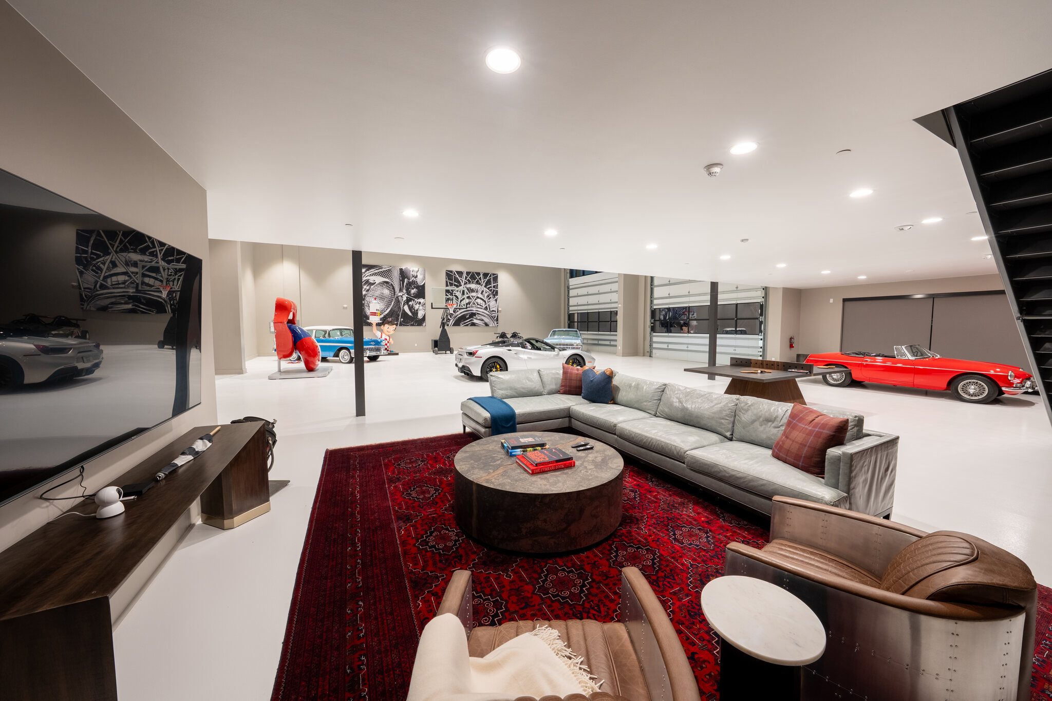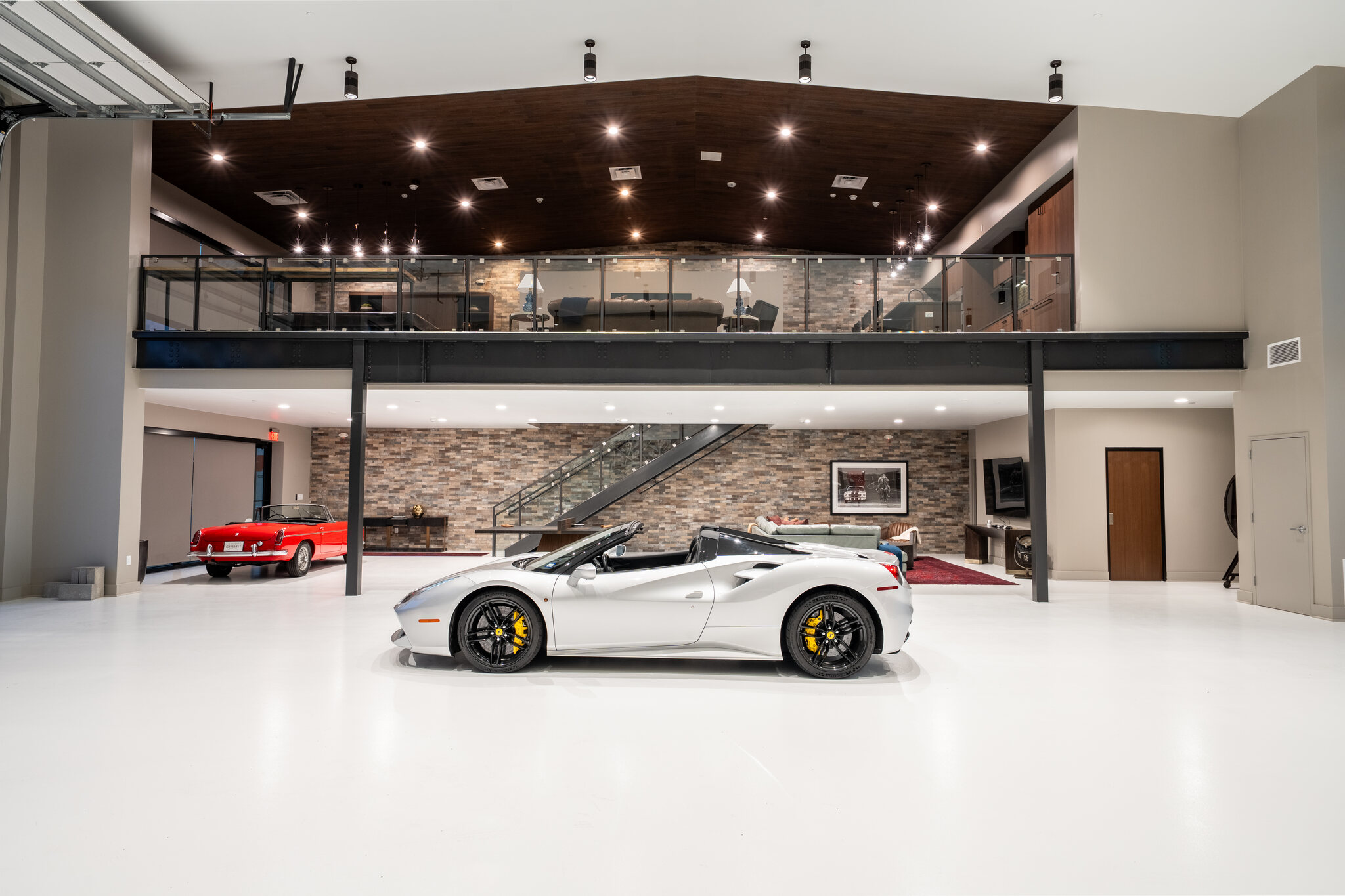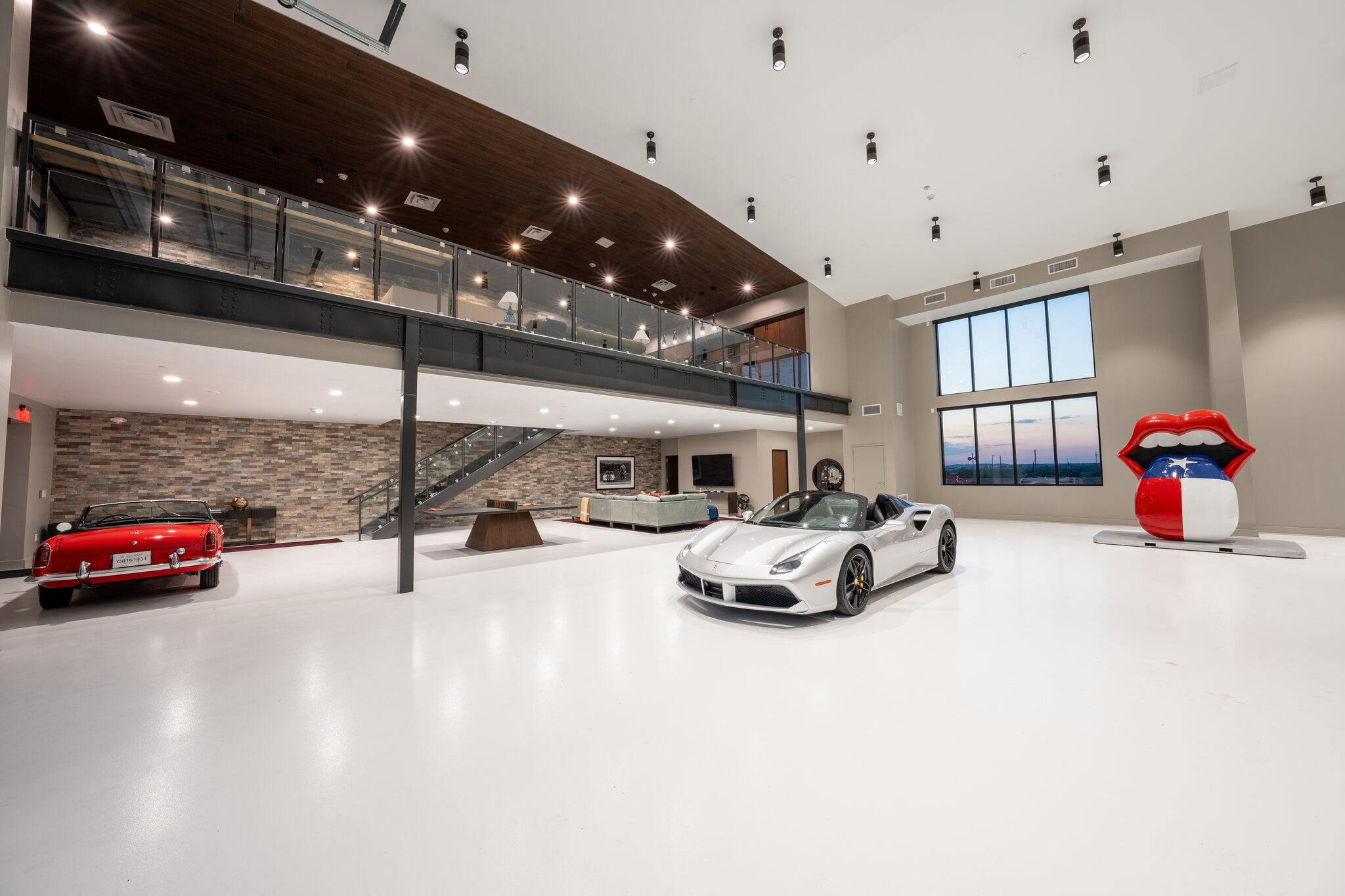 The XXL unit offers approximately 6,000 sq. ft. of total space, including a 4,500 sq. ft. ground-level garage with 20’+ double-height ceilings and capacity for 20–24 vehicles. The fully insulated, HVAC-equipped space features a high-load concrete slab, full utilities, and a large glass and metal roll-up door. Above, a 1,500 sq. ft. loft-style mezzanine provides flexible space ideal for a kitchen, bathroom, office, or lounge